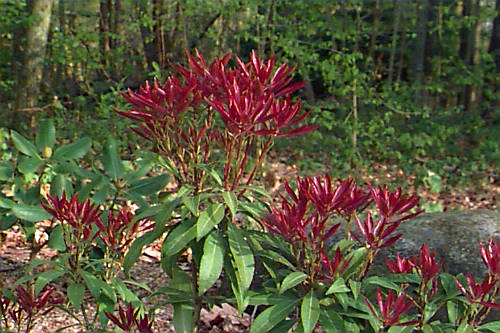 - leaves evergreen with shallow teeth on the margin. P. floribunda has cilate (hair-like) margins and Kalmia latifolia has entire margins.
