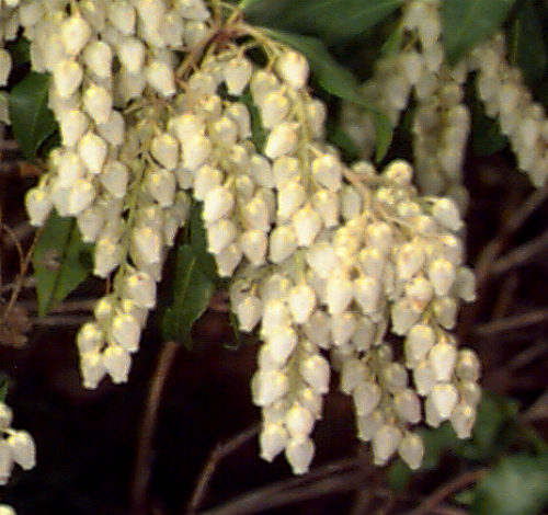 - pendulous clusters or white urn-shaped flowers in late winter through early spring