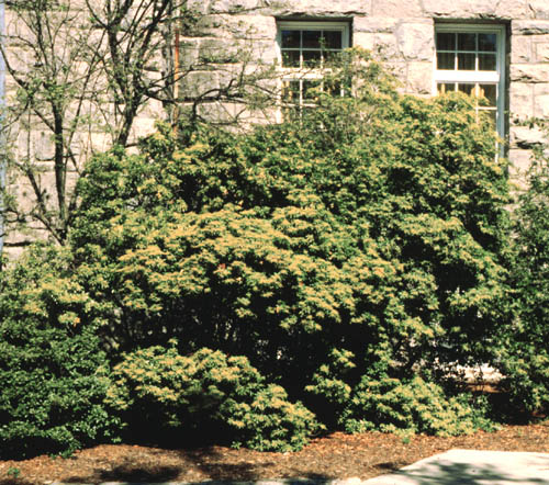 var. yakushimanum (also listed as 'Yakushima') - A questionable entity, but presumably describes plants with a dwarf, slow-growing habit. The leaves are dark green and the flowers white. Several cultivars have been selected from this variety, including 'Cavatine' and 'Prelude'.